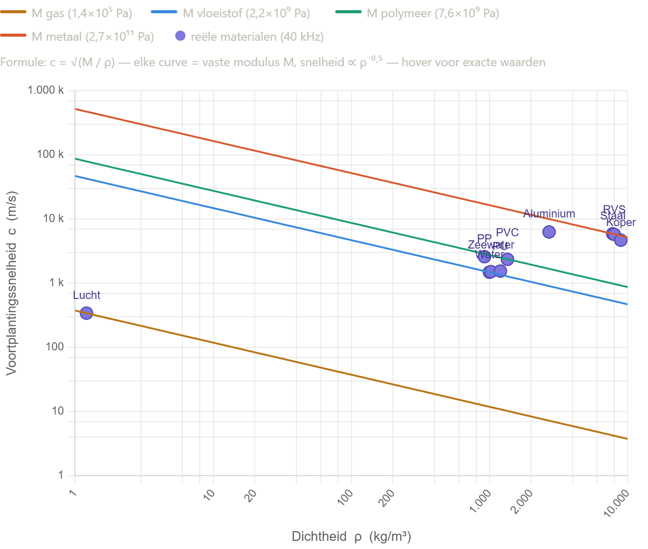 De curven: c = √(M/ρ) — elke lijn geldt voor een vaste modulus M. Op een log-log schaal zijn dit rechte lijnen met helling −½, wat de vierkanteswortelrelatie bepalen. Verdubbel de moeite bij gelijke stijfheid → snelheid diepte met factor √2 ≈ 1,41.